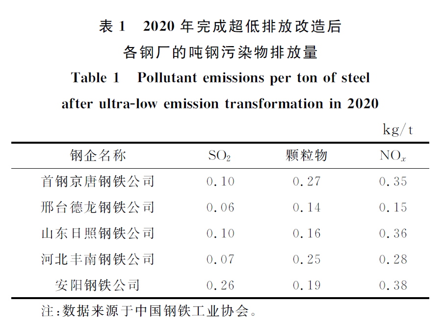 截至到2020年底,中國有229家鋼鐵企業(yè)6.2億t粗鋼正在進(jìn)行超低排放改造。重點(diǎn)區(qū)域的103家鋼鐵企業(yè),約3.2億t粗鋼產(chǎn)能正在開展實(shí)施超低排放改造的評估監(jiān)測工作。截止到目前為止,中國已經(jīng)有首鋼遷鋼公司、首鋼京唐公司、山鋼日照公司、邢臺德龍鋼鐵集團(tuán)、山西太鋼不銹鋼公司、新興鑄管公司、河北豐南鋼鐵公司、上海梅鋼、首鋼長鋼、安陽鋼鐵公司、山西建龍和江蘇永鋼等11家鋼鐵企業(yè)完成了超低排放改造和評估監(jiān)測工作。從表1可以看出,經(jīng)過超低排放改造后,噸鋼各項(xiàng)污染物的排放量大幅下降。