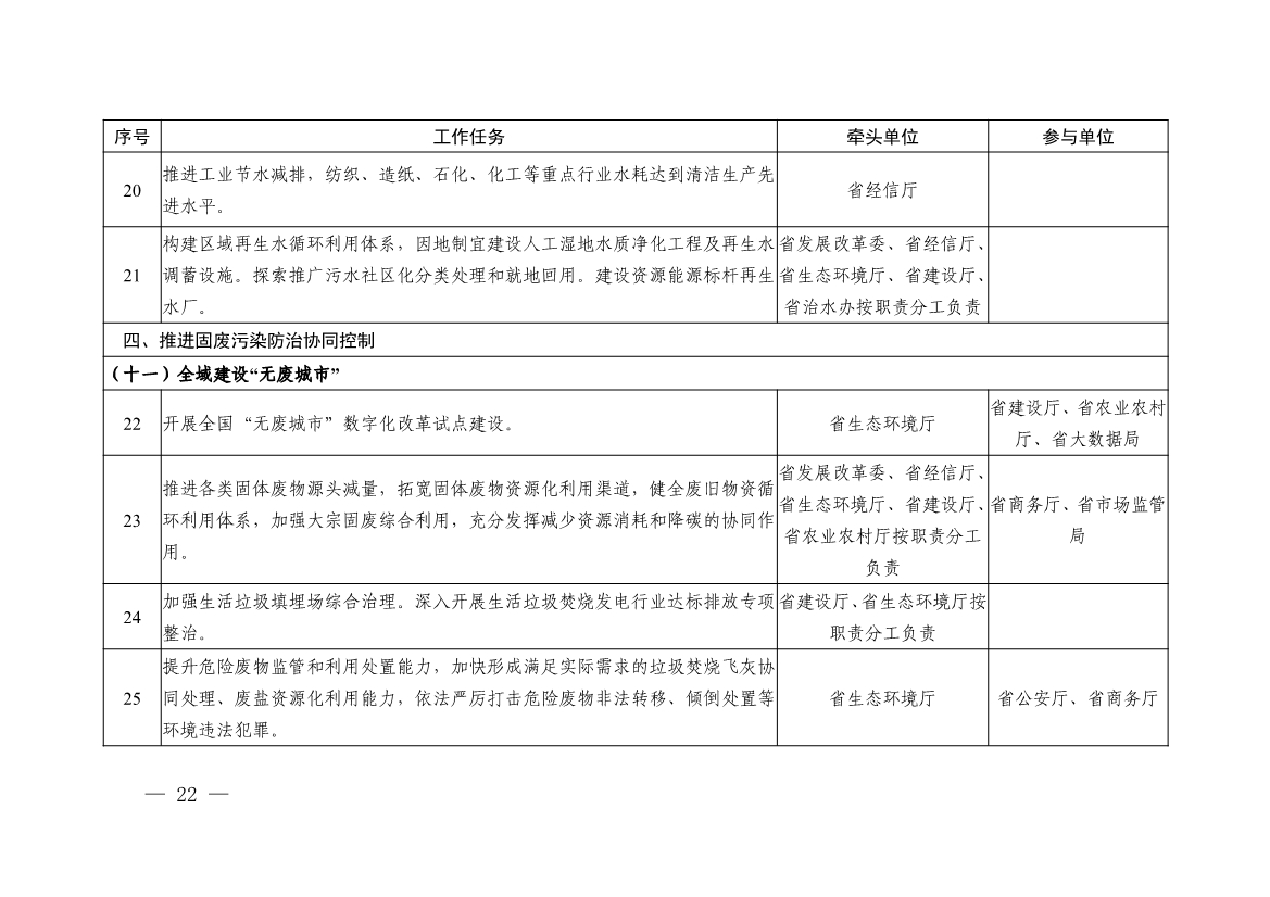 (十一)全域建設(shè)“無(wú)廢城市”。開(kāi)展全國(guó)“無(wú)廢城市”數(shù)字化改革試點(diǎn)建設(shè)。推進(jìn)各類(lèi)固體廢物源頭減量。加強(qiáng)生活垃圾填埋場(chǎng)綜合治理。深入開(kāi)展生活垃圾焚燒發(fā)電行業(yè)達(dá)標(biāo)排放專(zhuān)項(xiàng)整治。提升危險(xiǎn)廢物監(jiān)管和利用處置能力,加快形成滿(mǎn)足實(shí)際需求的垃圾焚燒飛灰協(xié)同處理、廢鹽資源化利用能力。到2025年,全省城鄉(xiāng)生活垃圾分類(lèi)實(shí)現(xiàn)全覆蓋,基本實(shí)現(xiàn)危險(xiǎn)廢物“趨零填埋”。