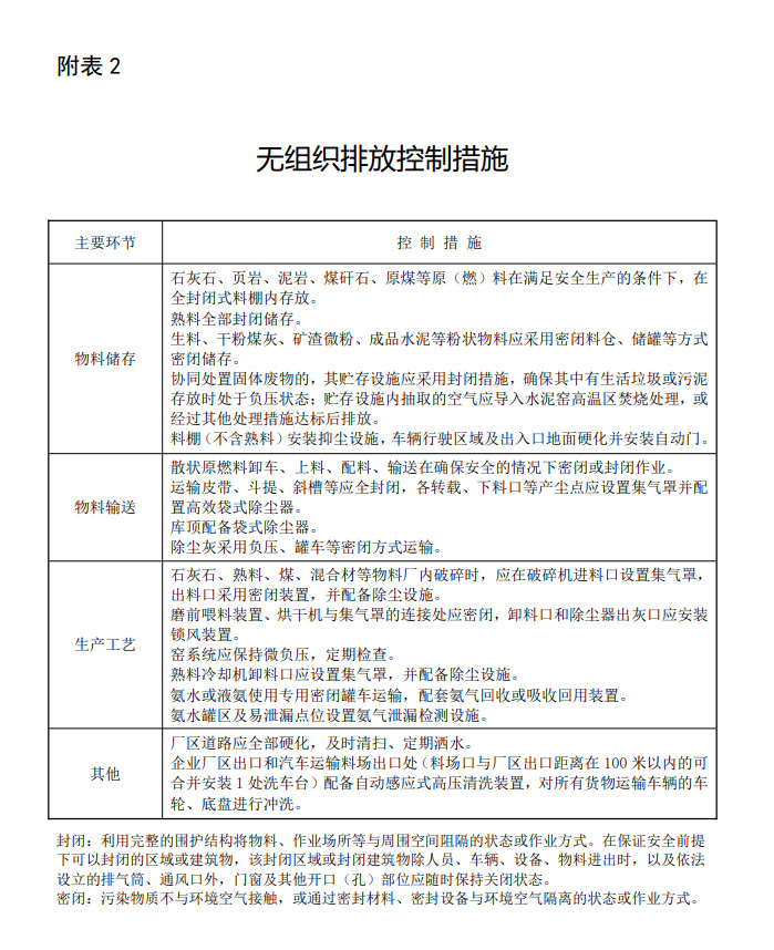 (二)無(wú)組織排放控制措施。物料儲(chǔ)存、物料輸送、生產(chǎn)工藝過(guò)程等無(wú)組織排放源,在保障安全生產(chǎn)的前提下,采取密閉、封閉等有效控制設(shè)施。無(wú)組織排放控制設(shè)施應(yīng)與生產(chǎn)工藝設(shè)施同步正常運(yùn)行,確保產(chǎn)塵點(diǎn)及生產(chǎn)設(shè)施無(wú)可見(jiàn)煙粉塵外逸,廠區(qū)整潔無(wú)積塵。具體要求見(jiàn)附表2。