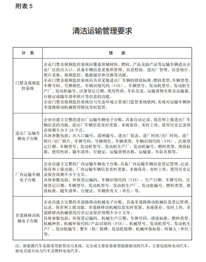 強(qiáng)化運(yùn)輸管理。企業(yè)應(yīng)配備專職人員加強(qiáng)運(yùn)輸管理,建設(shè)門禁和視頻監(jiān)控系統(tǒng),以及進(jìn)出廠運(yùn)輸車輛、廠內(nèi)運(yùn)輸車輛、非道路移動(dòng)機(jī)械電子臺(tái)賬。企業(yè)應(yīng)使用達(dá)標(biāo)車輛運(yùn)輸,鼓勵(lì)與供車單位、原輔材料供貨單位及產(chǎn)品購(gòu)買單位簽訂車輛排放達(dá)標(biāo)保證書、增加相應(yīng)合同條款、提供運(yùn)輸車輛年檢合格證明等方式實(shí)現(xiàn)車輛的達(dá)標(biāo)管理。具體要求見(jiàn)附表5。
