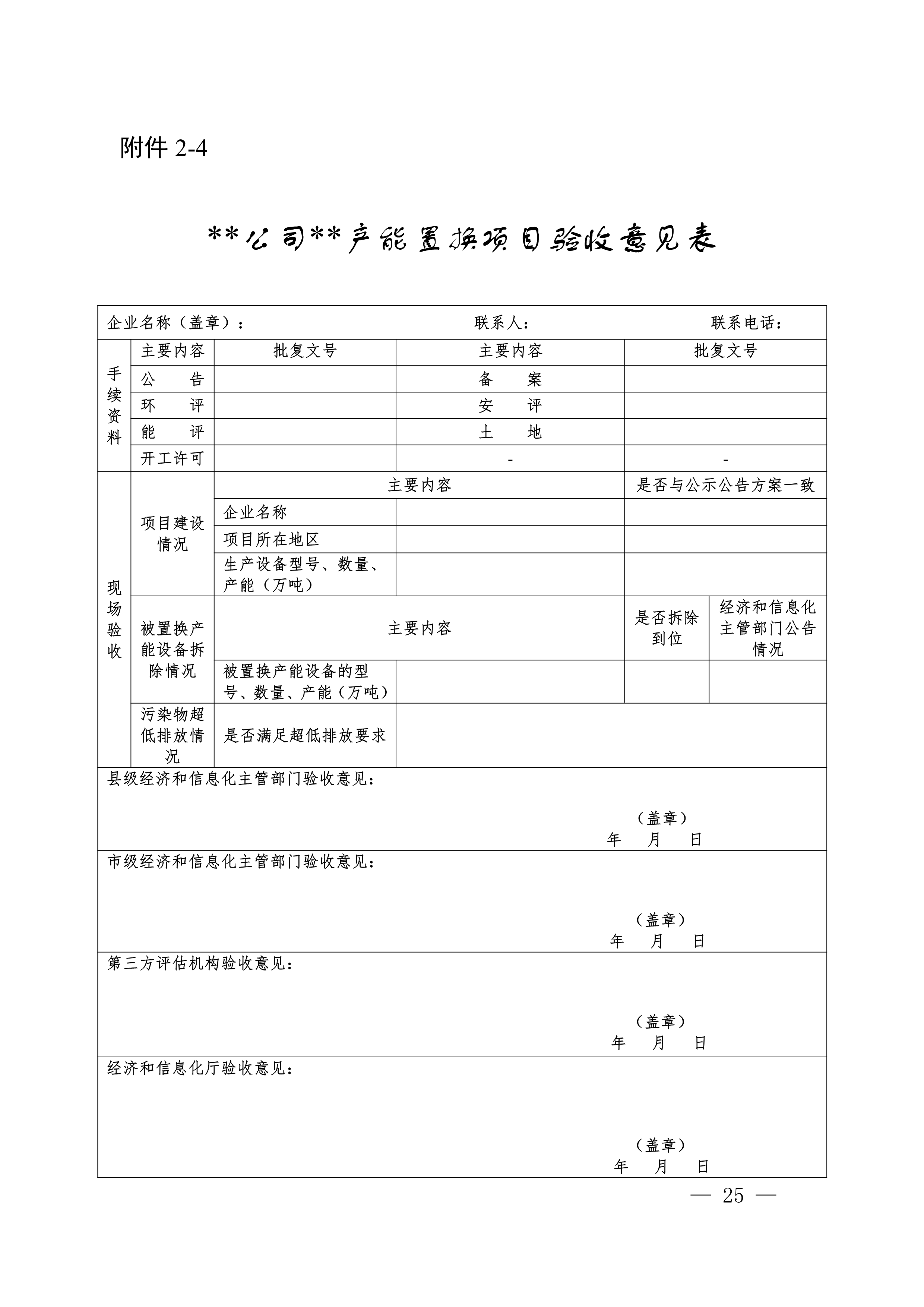 第十一條企業(yè)根據(jù)項目建設進度等實際情況,向所在地市級經(jīng)濟和信息化主管部門提出驗收申請,市級經(jīng)濟和信息化主管部門受理后,組織開展初步驗收,并報請經(jīng)濟和信息化廳復核驗收。經(jīng)濟和信息化廳牽頭聯(lián)合生態(tài)環(huán)境廳組織具有相關(guān)專業(yè)甲級資信等級的工程咨詢單位開展現(xiàn)場驗收,重點核實新建裝備型號、數(shù)量、產(chǎn)能等信息與已公告產(chǎn)能置換方案的一致性,退出產(chǎn)能設備拆除情況,以及污染物是否實現(xiàn)超低排放等。對驗收合格的,現(xiàn)場出具初步驗收意見;并組織各級填寫置換項目驗收意見表(見附件2-4)。對建設項目與置換公告方案不一致的,責成市級經(jīng)濟和信息化主管部門監(jiān)督整改,整改到位后,再進行驗收。